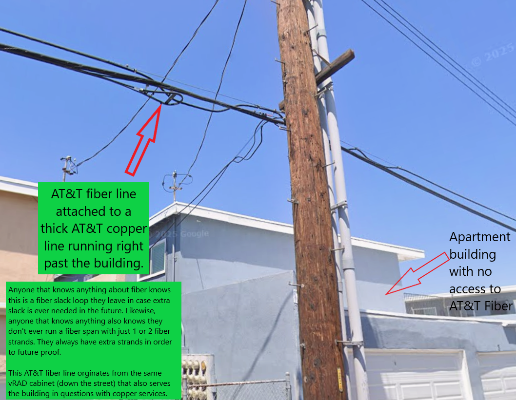 Based on publicly available information, John Stankey probably doesn't care about of the above. Why? He made sure his nice big 8281 sq ft, 5 bed and 6.5 bath house in Dallas has fiber internet available to it (per the FCC National Broadband Map). The AT&T fiber lines run right behind his back yard (can be seen from Google Maps) on utility poles literately in the same way as in the location above. He of course has AT&T fiber available. What a coincidence, right??? But no AT&T fiber services for the building in question in the images above.